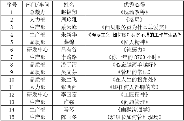 本次為第四季度讀書心得評選活動,經(jīng)總裁辦校對、審核,從100多篇心得中初選出30篇,再根據(jù)主題明確、立意新穎、結(jié)合工作實際、文字通順完整等篩選出16篇優(yōu)秀心得,其中獲得本季度“最佳讀書心得”得主是生產(chǎn)部潘靈橋《不會帶團隊,你就只能干到死》。其余優(yōu)秀文稿如下: