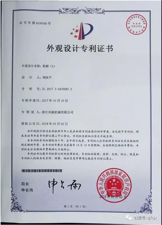 2018年3月榮獲“輪轂”外觀設計專利證書