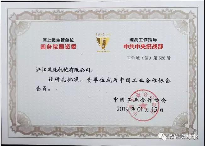 2019年1月榮獲中國工業合作協會頒發的“2019中國工業合作協會會員”