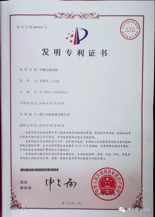 2018年2月榮獲“外翻邊屢帶輪”發明專利證書